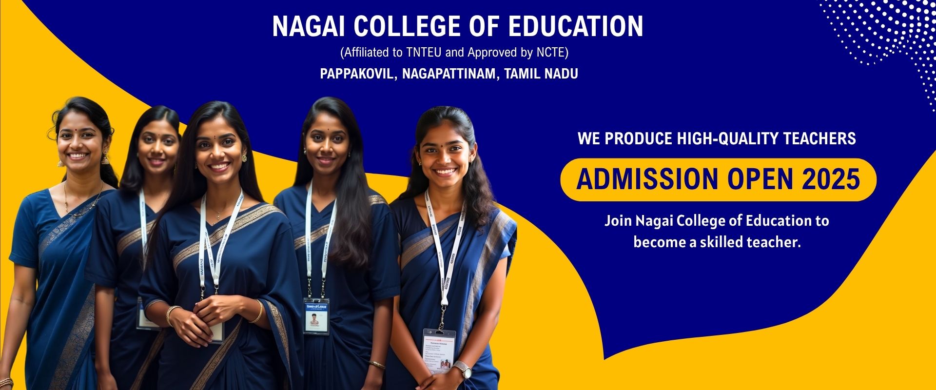The institution is affiliated with Tamil Nadu Teachers Education University (TNTEU), Chennai, and is recognized by the National Council for Teacher Education (NCTE), ensuring compliance with national standards in teacher training. With a focus on quality education, pedagogical innovation, and professional development, Nagai College of Education equips its students with the skills and knowledge necessary to meet the dynamic demands of the teaching profession.